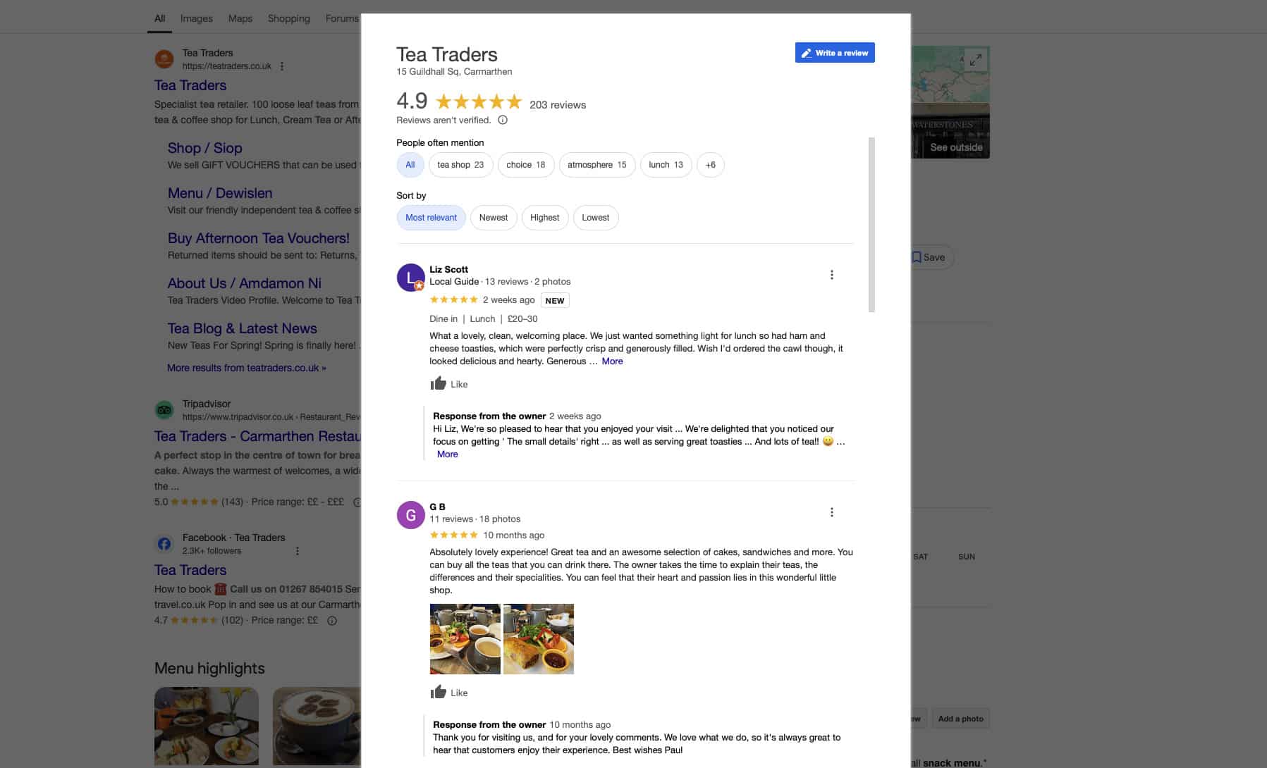 Tea Traders Google reviews screenshot, 4.9-star tea shop in Carmarthen